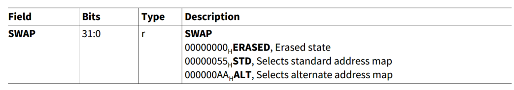 配置UCB_SWAP_ORIG/UCB_SWAP_COPY中的UCB_SWAP_ORIG_MARKERLx/UCB_SWAP_COPY_MARKERLx,激活下一次reset需要运行的标准(0x00000055)还是备选(0x000000AA)地址。在寄存器SCU_SWAPCTRL中,可以查看当前激活的是标准还是备选地址。