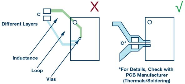图13.解耦电容降低抖动的错误(左)和正确(右)位置