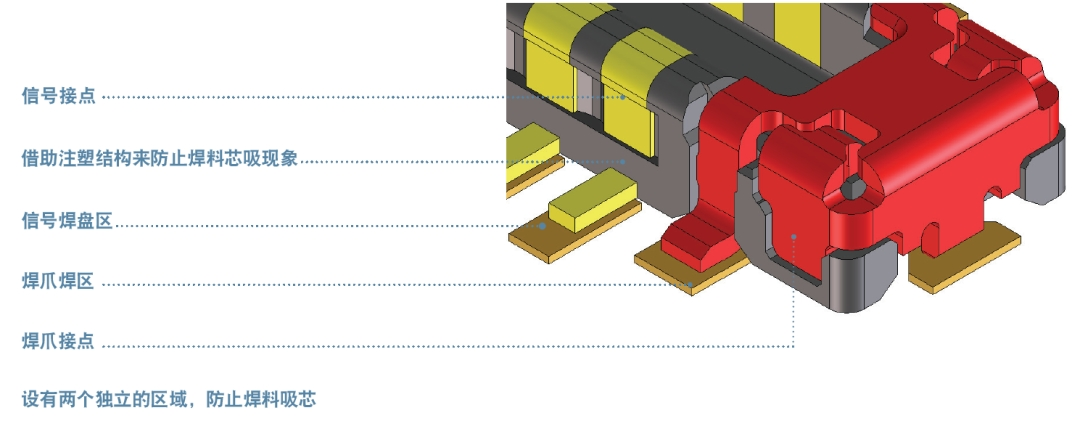 ○接点区与焊盘区分开。端子和焊爪用镍屏障隔开