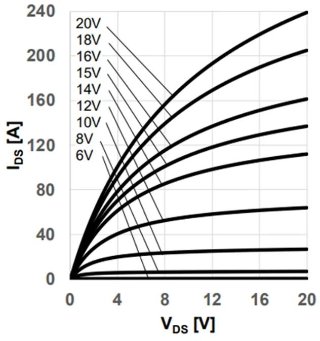 SiC MOSFET的导通损耗表现相类似,如图2所示为IMW120R030M1H的输出特性。相比于图1的横坐标,图2的电压跨度更大,也就是说SiC MOSFET适合门极电压更高(比如18V),导通损耗更小,获益更大。但是考虑门极氧化层的可靠性,使用电压一般不会超过20V,英飞凌1200V的SiC MOSFET建议使用电压为18V。