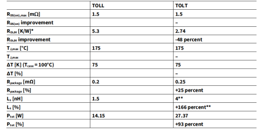 可以发现和TOLL封装相比较,TOLT最大的改进在于热阻降低非常明显整体耗散功提升超过90%以上。