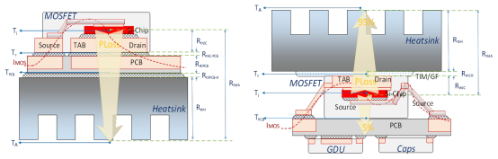 2,消除PCB和焊料互连来缩短散热通路,对MOSFET的性能提升具有显著影响。有实验对这两种方案进行了研究,结果显示:即使采用传统方案,使用FR4型PCB时,从结区到散热器的总热阻仍可至少降低20%。对于研发工程师而言,这意味着要么在相同功率应用下节