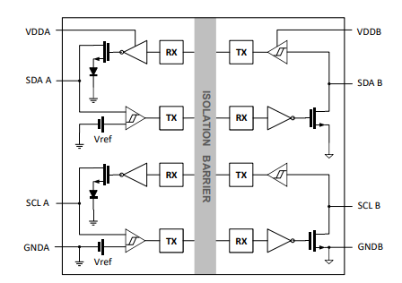CA-IS3020S芯片为兼容 I 2C 接口的双向通讯低功耗隔离器,隔离器的输入侧与输出侧具备电气隔离特性,该电气隔离屏障由二氧化硅构成的高压隔离电容构成。CA-IS3020S芯片的数据传输通道(SDA)和时钟传输通道(SCK)均具有双向传输功能。如果在实际应用场景中,存在从机(Slave)下拉时钟线的可能性,则需要使用 CA-IS3020S 芯片。