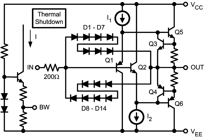 The LME49600 offers a pin-selectable bandwidth: a low current, 110MHz bandwidth mode that consumes 7.3mA and a wide 180MHz bandwidth mode that consumes 13.2mA. In both modes the LME49600 has a nominal 2000V/μs slew rate. Bandwidth is easily adjusted by either leaving the BW pin unconnected or connecting a resistor between the BW pin and the VEE pin.