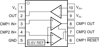 INA203、INA204 和 INA205 还整合了两个带 0.6V 内部基准的开漏比较器。14 引脚版本的比较器基准可用外部输入覆盖。比较器 1 具有锁存功能,而比较器 2 的延迟可由用户通过编程设定。此外,14 引脚版本还提供 1.2V 基准输出。