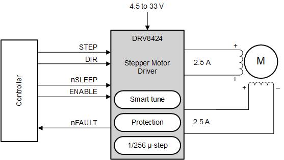 借助简单的 STEP/DIR 接口,可通过外部控制器管理步进电机的方向和步进速率。这款器件可配置为多种步进模式,从全步进模式到 1/256 微步进模式皆可。该器件通过专用的 nSLEEP 引脚提供低功耗睡眠模式。提供的保护特性包括:电源欠压、电荷泵故障、过流、短路以及过热保护。故障状态通过 nFAULT 引脚指示。