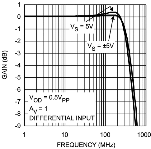 With external gain set resistors, the LMH6550 can be used at any desired gain. Gain flexibility coupled with high speed makes the LMH6550 suitable for use as an IF amplifier in high-performance communications equipment.