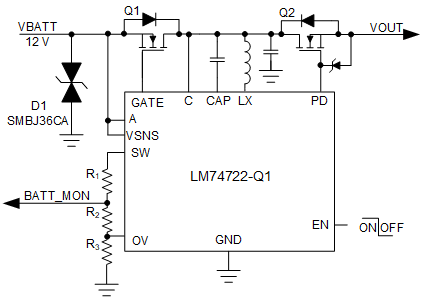 LM74722-Q1 理想二极管控制器可驱动和控制外部背对背 N 沟道 MOSFET,从而模拟具有电源路径开/关控制和过压保护功能的理想二极管整流器。3V 至 65V 的宽输入电源电压可保护和控制 12V 和 24V 汽车类电池供电的 ECU。该器件可承受并保护负载免受低至 –65V 的负电源电压的影响。集成的理想二极管控制器 (GATE) 可驱动第一个 MOSFET 来代替肖特基二极管,实现反向输入保护和输出电压保持功能。具有快速导通和关断比较器的强大升压稳压器可确保在汽车测试(如 ISO16750 或 LV124)期间实现稳健、高效的 MOSFET 开关性能,期间 ECU 会收到输入短时中断以及频率高达 200kHz 的交流叠加输入信号。运行期间的低静态电流 35µA(最大值)可实现常开型系统设计。在电源路径中使用了第二个 MOSFET 的情况下,该器件允许使用 EN 引脚实现负载断开控制。在 EN 处于低电平时,静态电流降至 3.3µA(最大值)。该器件具有可调节过压切断保护或使用 OV 引脚的过压钳位保护。