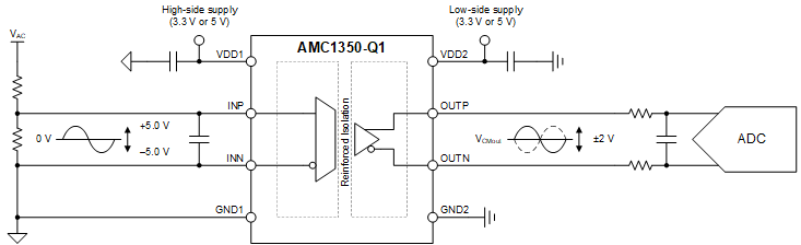 AMC1350-Q1 的高阻抗输入针对与高阻抗电阻分压器或具有高输出电阻的其他电压信号源的连接进行了优化。具有出色的精度和低温漂,可支持精确的交流和直流电压检测,适用于车载充电器 (OBC)、直流/直流转换器、牵引逆变器或其他必须支持高共模电压的应用。
