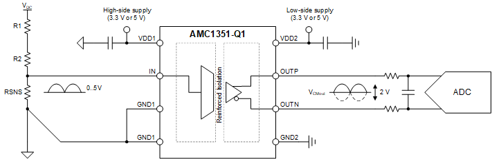 AMC1351-Q1 的高阻抗输入针对与高阻抗电阻分压器或具有高输出电阻的其他电压信号源的连接进行了优化。具有出色的精度和低温漂,可支持精确的直流电压检测,适用于直流/直流转换器、变频器、电机驱动或其他必须支持高共模电压的应用。