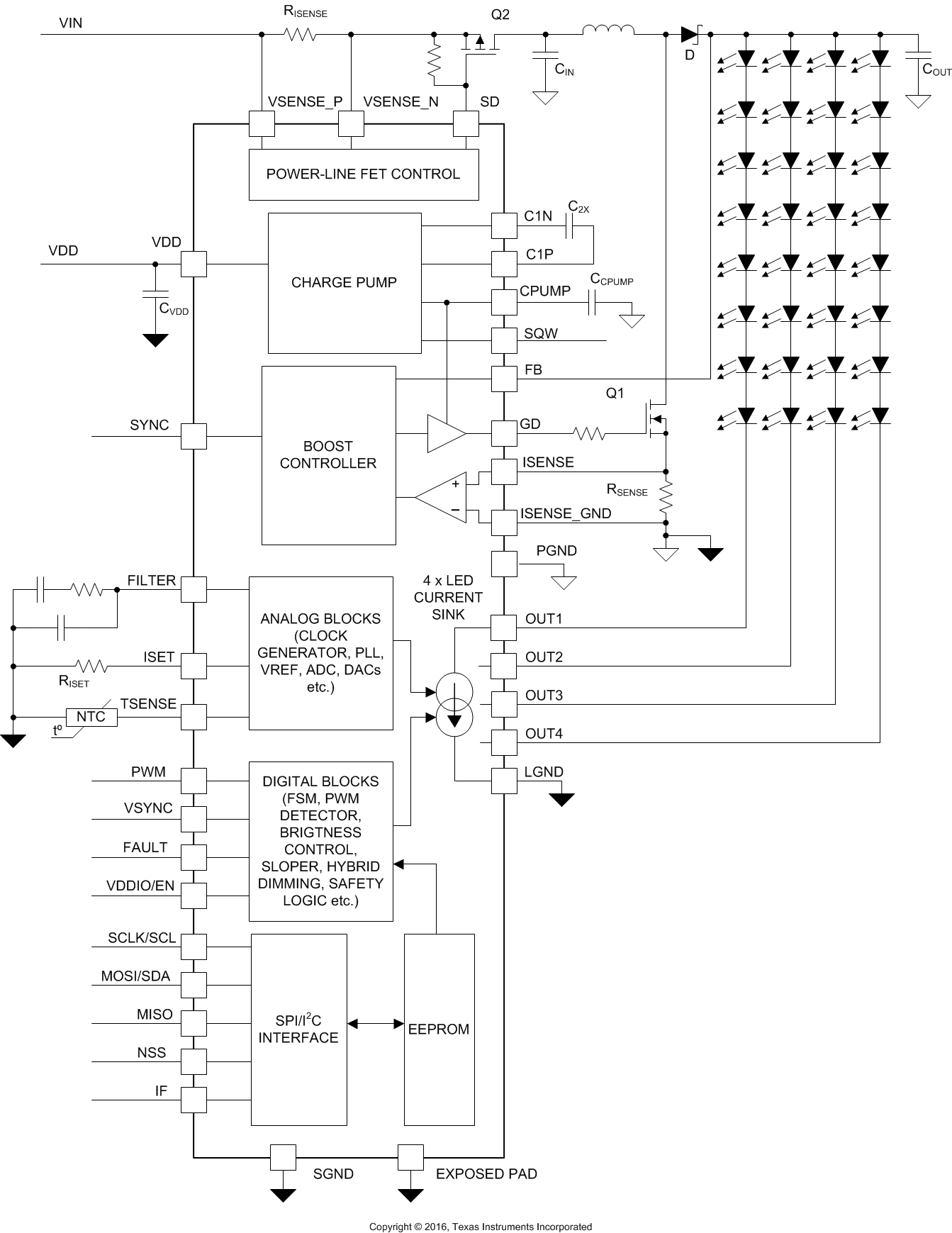 | Features | Adjustable Switch Frequency, Boost Sync, Fault Diagnostic, Global dimming, Hybrid Dimming/Phase Shift, I2C control, Spread Spectrum |