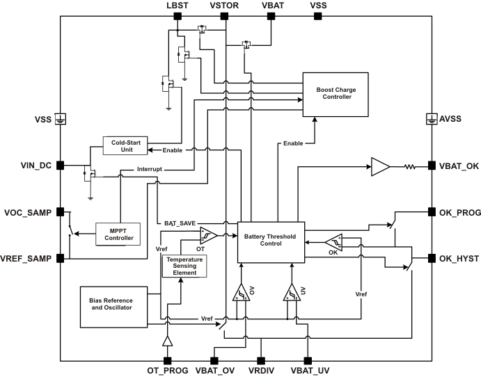 BQ25504 还采用可编程的最大功率点跟踪采样网络,从而对器件的功率传输进行优化。VIN_DC 开路电压采样通过外部电阻进行编程,并由外部电容 (C REF) 保持。
