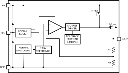PMOS 功率晶体管的使用意味着无需直流基极驱动电流对其进行偏置,因此无论负载电流、输入电压或者运行温度为何,接地引脚电流均可保持在 100µA 以下。