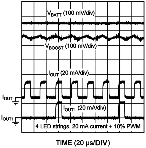 The boost converter has adaptive output-voltage control based on the LED driver voltages. This feature minimizes the power consumption by adjusting the voltage to lowest sufficient level in all conditions.