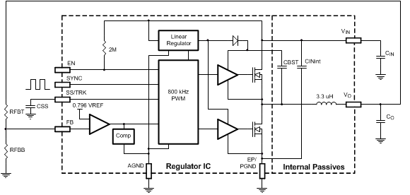 The LMZ23603 can accept an input voltage rail between 6 V and 36 V and deliver an adjustable and highly accurate output voltage as low as 0.8 V. The LMZ23603 only requires two external resistors and three external capacitors to complete the power solution. The LMZ23603 is a reliable and robust design with the following protection features: thermal shutdown, programmable input undervoltage lockout, output overvoltage protection, short circuit protection, output current limit, and allows start-up into a prebiased output. The sync input allows synchronization over the 650-kHz to 950-kHz switching frequency range.