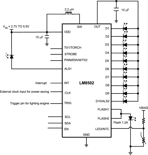 The LM8502 is a versatile LED driver suitable for multiple applications. It includes a 2MHz, fixed-frequency synchronous boost converter, 10 current sink LED outputs, 2 outputs for flash or haptic applications, ambient light sensing and PWM input.