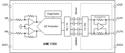 AMC1350 是一款隔离式精密放大器,此放大器的输出与输入电路由抗电磁干扰性能极强的隔离栅隔开。该隔离栅经认证可提供高达 5kVRMS 的增强型电隔离,符合 VDE V 0884-11 和 UL1577 标准,并且可支持最高 1.5kVRMS 的工作电压。