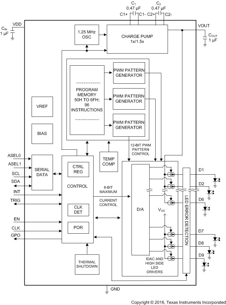 The LP5523 has an I2C-compatible control interface with four pin selectable addresses. The device has a flexible general purpose output (GPO), which can be used as a digital control pin for other devices. INT pin can be used to notify processor when a lighting sequence has ended (interrupt function). Also, the device has a trigger input interface, which allows synchronization, for example, between multiple LP5523 devices.