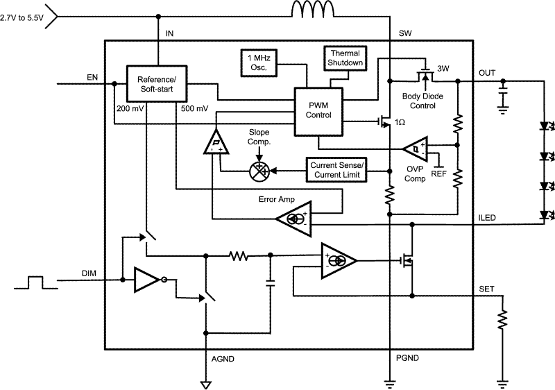 The LM3508 is a synchronous boost converter (no external Schottky diode required) that provides a constant current output. It is designed to drive up to 4 series white LEDs at 30mA from a single-cell Li-Ion battery. A single low power external resistor is used to set the maximum LED current. The LED current can be adjusted by applying a PWM signal of up to 100kHz to the DIM pin. Internal soft-start circuitry is designed to eliminate high in-rush current at start-up. For maximum safety, the device features an advanced short-circuit protection when the output is shorted to ground. Additionally, over-voltage protection and an 850kHz switching frequency allow for the use of small, low-cost output capacitors with lower voltage ratings. During shutdown, the output is disconnected from the input preventing a leakage current path through the LEDs to ground. The LM3508 is available in a tiny 9-bump chip-scale DSBGA package.