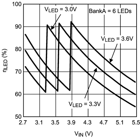 The device provides excellent efficiency without the use of an inductor by operating the charge pump in a gain of 3/2 or in Pass-Mode. The proper gain for maintaining current regulation is chosen, based on LED forward voltage, so that efficiency is maximized over the input voltage range.