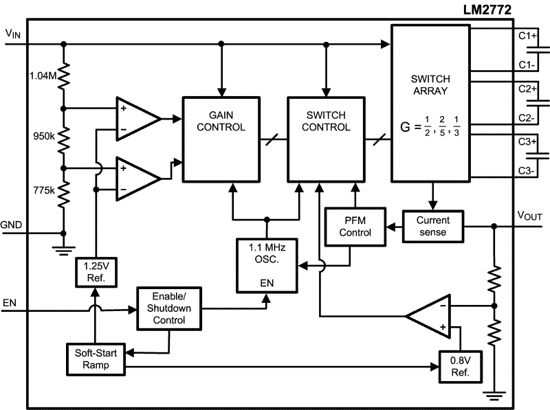 The LM2772 utilizes a highly efficient regulated multi-gain charge pump. Pre-regulated 1.1MHz fixed-frequency switching results in very low ripple and noise on both the input and the output. When output currents are low, the part automatically switches to a low-ripple PFM regulation mode to maintain high efficiency over the entire load range.