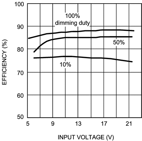 A DIM input pin controls LED brightness from analog or digital control signals. Dimming frequencies up to 25 kHz are possible with a contrast ratio of 100:1. Contrast ratios greater than 1000:1 are possible at lower dimming frequencies.