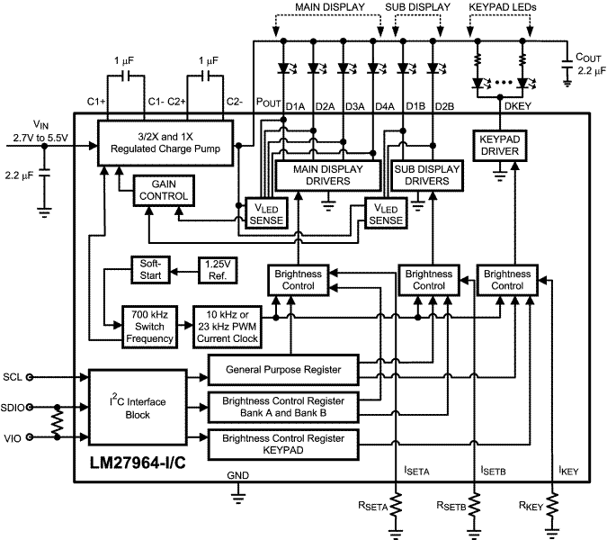 The LED driver current sources are split into two independently controlled groups. The primary group (4 LEDs) can be used to backlight the main phone display and the second group (2 LEDs) can be used to backlight a secondary display. A single Keypad LED driver can power up to 16 keypad LEDs with a current of 5mA each. The LM27964 has an I2C compatible interface that allows the user to independently control the brightness on each bank of LEDs.
