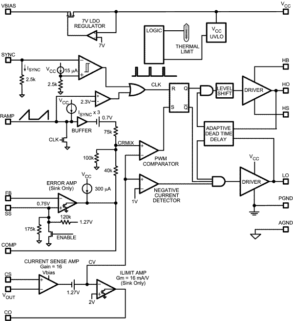 The LM25115 controller contains all of the features necessary to implement multiple output power converters utilizing the Secondary Side Post Regulation (SSPR) technique. The SSPR technique develops a highly efficient and well regulated auxiliary output from the secondary side switching waveform of an isolated power converter. Regulation of the auxiliary output voltage is achieved by leading edge pulse width modulation (PWM) of the main channel duty cycle. Leading edge modulation is compatible with either current mode or voltage mode control of the main output. The LM25115 drives external high side and low side NMOS power switches configured as a synchronous buck regulator. A current sense amplifier provides overload protection and operates over a wide common mode input range. Additional features include a low dropout (LDO) bias regulator, error amplifier, precision reference, adaptive dead time control of the gate signals and thermal shutdown.