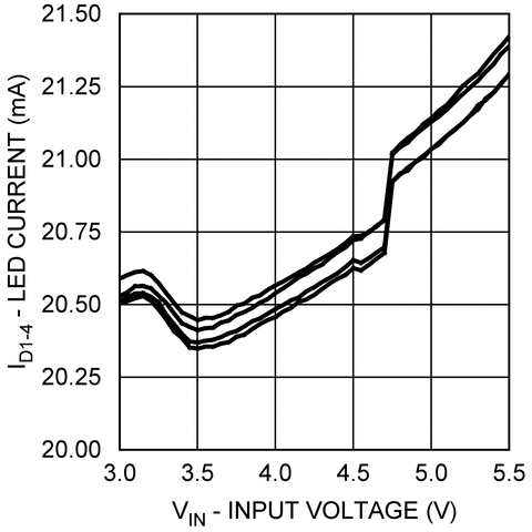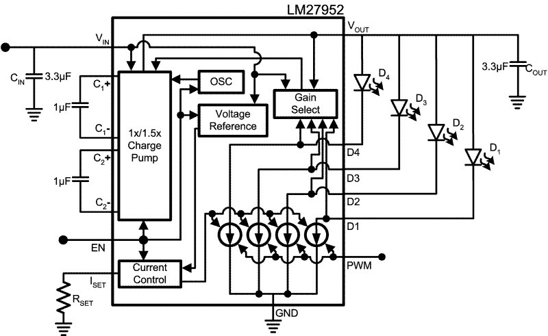 The LM27952 provides excellent efficiency without the use of an inductor by operating the charge pump in a gain of 3/2, or in a gain of 1. Maximum efficiency is achieved over the input voltage range by actively selecting the proper gain based on the LED forward voltage requirements.