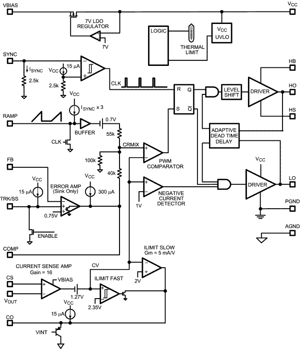 The LM5115A controller contains all of the features necessary to produce multiple tracking outputs using the Secondary Side Post Regulation (SSPR) technique. The SSPR technique develops a highly efficient and well regulated auxiliary output from the secondary side switching waveform of an isolated power converter. LM5115A can be also used as a standalone DC/DC synchronous buck controller (Refer to section). Regulation of the auxiliary output voltage is achieved by leading edge pulse width modulation (PWM) of the main channel duty cycle. Leading edge modulation is compatible with either current mode or voltage mode control of the main output. The LM5115A drives external high-side and low-side NMOS power switches configured as a synchronous buck regulator. A current sense amplifier provides overload protection and operates over a wide common mode input range. Additional features include a low dropout (LDO) bias regulator, error amplifier, precision reference, adaptive dead time control of the gate signals and thermal shutdown.