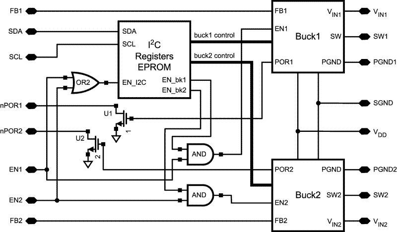 There is a power-on-reset function that monitors the level of the output voltage to avoid unexpected power losses. The independent enable pin for each output allows for simple and effective power sequencing.