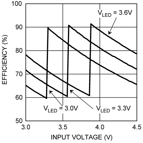 The device provides excellent efficiency without the use of an inductor by operating the charge pump in a gain of 3/2, or in Pass-Mode. The proper gain for maintaining current regulation is chosen based on LED forward voltage, so that efficiency is maximized over the input voltage range.