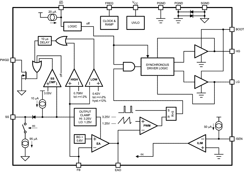 The LM2742 is a high-speed, synchronous, switching regulator controller. It is intended to control currents of 0.7A to 20A with up to 95% conversion efficiencies. Power up and down sequencing is achieved with the power-good flag, adjustable soft-start and output enable features. The LM2742 operates from a low-current 5V bias and can convert from a 1V to 16V power rail. The part utilizes a fixed-frequency, voltage-mode, PWM control architecture and the switching frequency is adjustable from 50kHz to 2MHz by setting the value of an external resistor. Current limit is achieved by monitoring the voltage drop across the on-resistance of the low-side MOSFET, which enables on-times on the order of 40ns, one of the best in the industry. The wide range of operating frequencies gives the power supply designer the flexibility to fine-tune component size, cost, noise and efficiency. The adaptive, non-overlapping MOSFET gate-drivers and high-side bootstrap structure helps to further maximize efficiency. The high-side power FET drain voltage can be from 1V to 16V and the output voltage is adjustable down to 0.6V.