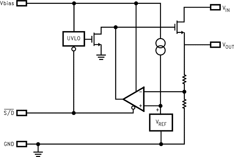 The LP38842 is a high current, fast response regulator which can maintain output voltage regulation with minimum input to output voltage drop. Fabricated on a CMOS process, the device operates from two input voltages: Vbias provides voltage to drive the gate of the N-MOS power transistor, while Vin is the input voltage which supplies power to the load. The use of an external bias rail allows the part to operate from ultra low Vin voltages. Unlike bipolar regulators, the CMOS architecture consumes extremely low quiescent current at any output load current. The use of an N-MOS power transistor results in wide bandwidth, yet minimum external capacitance is required to maintain loop stability.