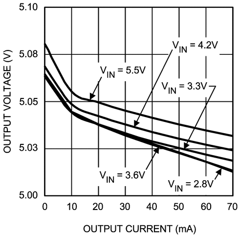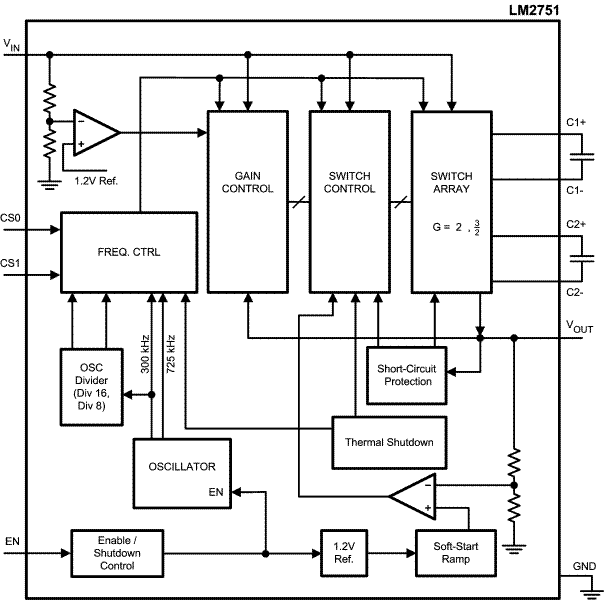 The LM2751 provides excellent efficiency without the use of an inductor by operating the charge pump in a gain of 3/2 or 2. The proper gain for maintaining regulation is chosen so that efficiency is maximized over the input voltage range.