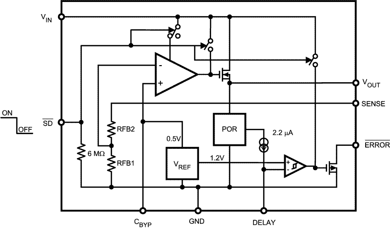 The LP3997 also includes an out-of-regulation error flag. When the output is more than 5% below its nominal voltage, the error flag sets to low. If a capacitor is connected to device’s delay pin, a delayed power-on reset signal will be generated.