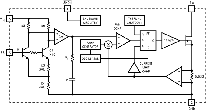 Protection is provided through cycle-by-cycle current limiting and thermal shutdown. Internal compensation simplifies design and reduces component count.
