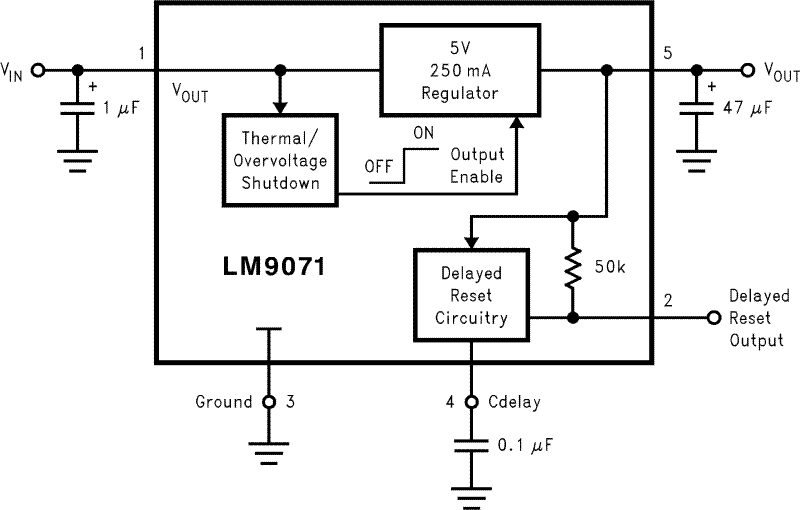 The LM9071 is a 5V, 250 mA low-dropout voltage regulator. The regulator features an active low delayed reset output flag which can be used to reset a microprocessor system on turn-ON and in the event that the regulator output falls out of regulation for any reason. An external capacitor programs a delay time interval before the reset output can return high.