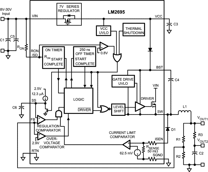 The LM2695 Step Down Switching Regulator features all of the functions needed to implement a low cost, efficient, buck bias regulator capable of supplying 1.25A to the load. This buck regulator contains a 33V N-Channel Buck Switch, and is available in the thermally enhanced WSON-10 and HTSSOP-14 packages. The hysteretic regulation scheme requires no loop compensation, results in fast load transient response, and simplifies circuit implementation. The operating frequency remains constant with line and load variations due to the inverse relationship between the input voltage and the on-time. The current limit detection is set at 1.25A. Additional features include: VCC under-voltage lockout, thermal shutdown, gate drive under-voltage lockout, and maximum duty cycle limiter.