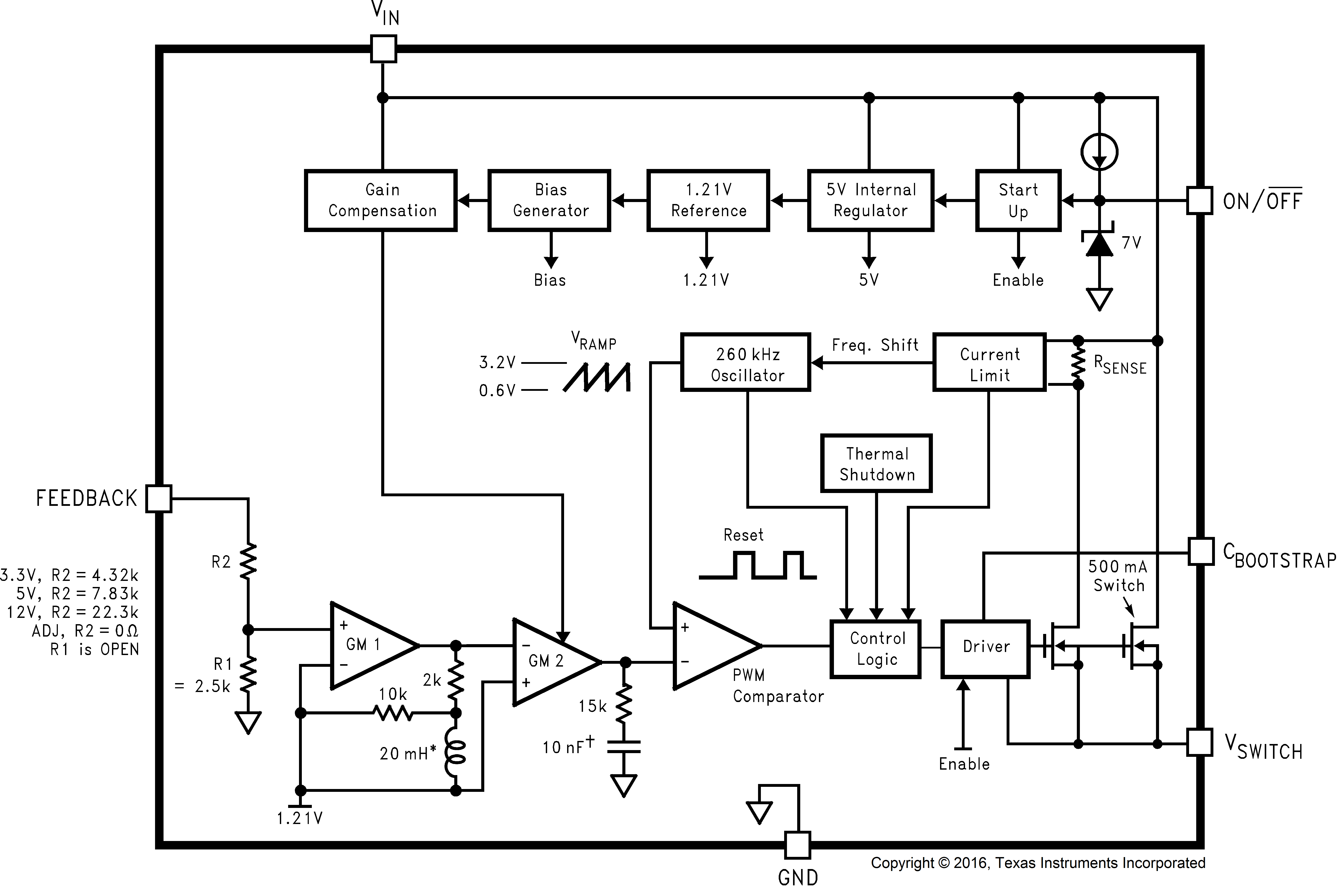 LM2674 系列在 260kHz 的开关频率下运行,因此采用的滤波器元件可比更低频率的开关稳压器所需的元件尺寸更小。由于效率非常高 (> 90%),只需通过印刷电路板上的覆铜线迹进行散热。