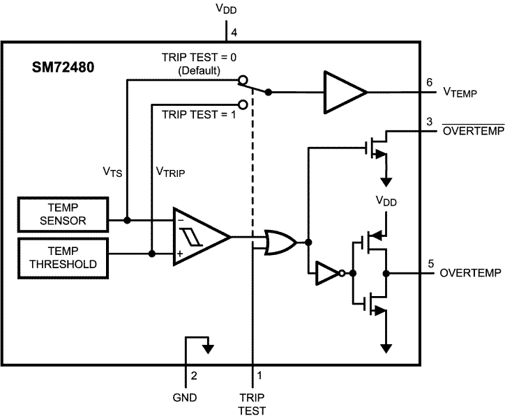 In normal operation the SM72480 temperature switch outputs assert when the die temperature exceeds TTRIP. The temperature switch outputs will reset when the temperature falls below a temperature equal to (TTRIP − THYST). The OVERTEMP digital output, is active-high with a push-pull structure, while the OVERTEMP digital output, is active-low with an open-drain structure.