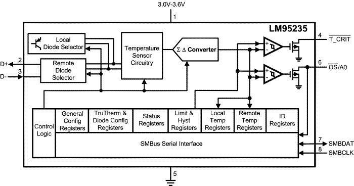 The LM95235 is an 11-bit digital temperature sensor with a 2-wire System Management Bus (SMBus) interface and TruTherm technology that can monitor the temperature of a remote diode as well as its own temperature. The LM95235 can be used to very accurately monitor the temperature of external devices such as microprocessors, graphics processors, or a diode-connected MMBT3904 transistor. For automotive applications the LM95235Q is available that is AEC-Q100 Grade3 compliant and is manufactured on an Automotive Grade Flow. TruTherm BJT (transistor) beta compensation technology allows the LM95235 to precisely monitor thermal diodes found in 90 nm and smaller geometry processes. LM95235 reports temperature in two different formats for +127.875°C/-128°C range and 0°C/255°C range. The LM95235 T_CRIT and OS outputs are asserted when either unmasked channel exceeds its programmed limit and can be used to shutdown the system, to turn on the system fans, or as a microcontroller interrupt function. The current status of the T_CRIT and OS pins can be read back from the status registers via the SMBus interface. All limits have a shared programmable hysteresis register.