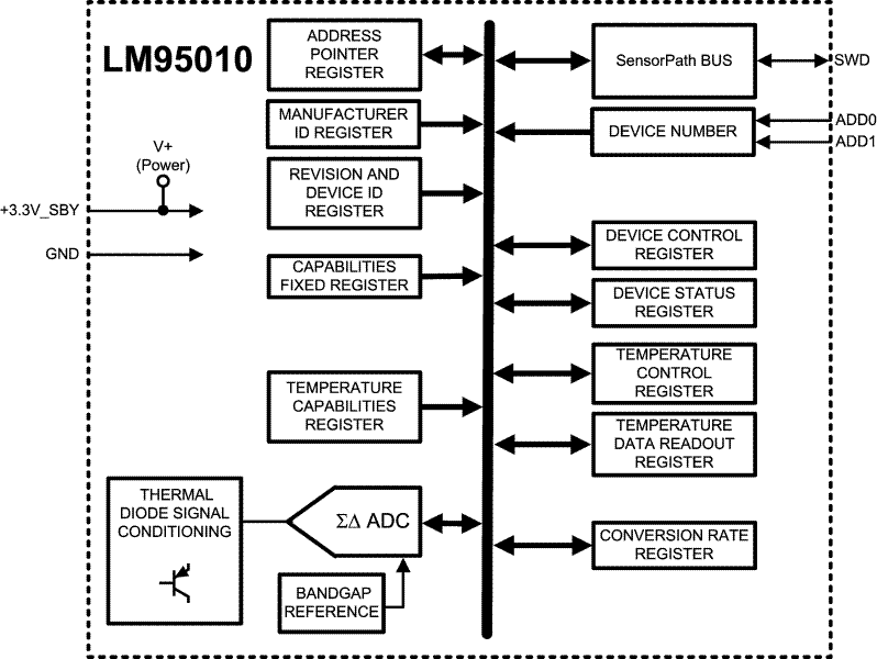 The LM95010 is a digital output temperature sensor that has single-wire interface compatible with the SensorPath interface. It uses a ΔVbe analog temperature sensing technique that generates a differential voltage that is proportional to temperature. This voltage is digitized using a Sigma-Delta analog-to-digital converter. The LM95010 is part of a hardware monitor system, comprised of two parts: the PC System Health Controller (Master), such as a Super I/O, and up to seven slaves of which four can be LM95010s. Using SensorPath, the LM95010 will be controlled by the master and report to the master its own die temperature. SensorPath data is pulse width encoded, thereby allowing the LM95010 to be easily connected to many general purpose micro-controllers.