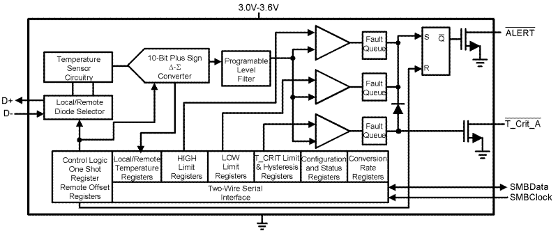 Activation of the ALERT output occurs when any temperature goes outside a preprogrammed window set by the HIGH and LOW temperature limit registers or exceeds the T_CRIT temperature limit. Activation of the T_CRIT_A occurs when any temperature exceeds the T_CRIT programmed limit. The LM86 is pin and register compatible with the the Analog Devices ADM1032 and Maxim MAX6657/8.