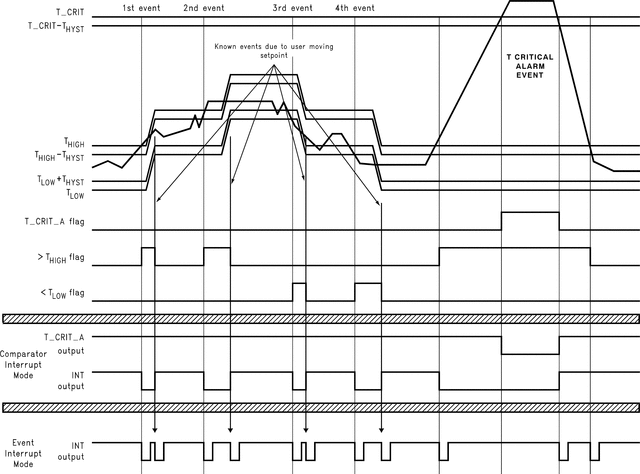 The host can program both the upper and lower limits of the window as well as the critical temperature limit. Programmable hysterisis as well as a fault queue are available to minimize false tripping. Two pins (A0, A1) are available for address selection. The sensor powers up with default thresholds of 2°C THYST, 10°C TLOW, 64°C THIGH, and 80°C T_CRIT.