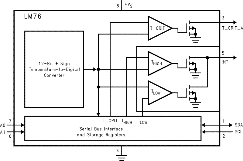The LM76 is a digital temperature sensor and thermal window comparator with an I2C Serial Bus interface with an accuracy of ±1°C. This accuracy for the LM76CHM is specified for a −10°C to 45°C temperature range. The LM76CHM is specified with an accuracy ±0.5°C at 25°C. The window-comparator architecture of the LM76 eases the design of temperature control systems conforming to the ACPI (Advanced Configuration and Power Interface) specification for personal computers. The open-drain Interrupt (INT) output becomes active whenever temperature goes outside a programmable window, while a separate Critical Temperature Alarm (T_CRIT_A) output becomes active when the temperature exceeds a programmable critical limit. The INT output can operate in either a comparator or event mode, while the T_CRIT_A output operates in comparator mode only.