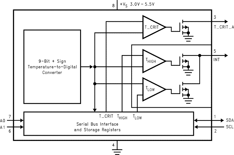 The host can program both the upper and lower limits of the window as well as the critical temperature limit. Programmable hysterisis as well as a fault queue are available to minimize false tripping. Two pins (A0, A1) are available for address selection. The sensor powers up with default thresholds of 2°C THYST, 10°C TLOW, 64°C THIGH, and 80°C T_CRIT.