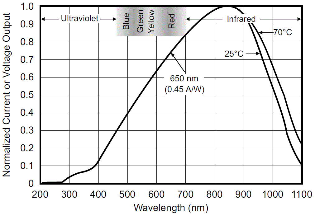 The 0.09 inch × 0.09 inch (2.29 mm × 2.29 mm) photodiode operates in the photoconductive mode for excellent linearity and low dark current.
