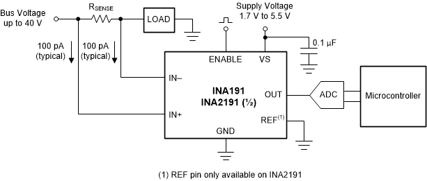INA191 由 1.7V 至 5.5V 单电源供电,在启用时消耗的最大电源电流为 65µA,在禁用时仅为 100nA。该器件的额定工作温度范围为 –40°C 至 +125°C,采用 DSBGA-6 (INA191) 和 DSBGA-12 (INA2191) 封装。