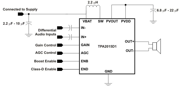 内置的升压转换器为 D 类放大器提供 5.5V 的电源电压。相比直接连接电池供电的独立放大器,这款放大器可提供更加响亮的音频输出。SpeakerGuardTM AGC 可调节 D 类放大器增益,从而限制电池电流并防止严重削波。